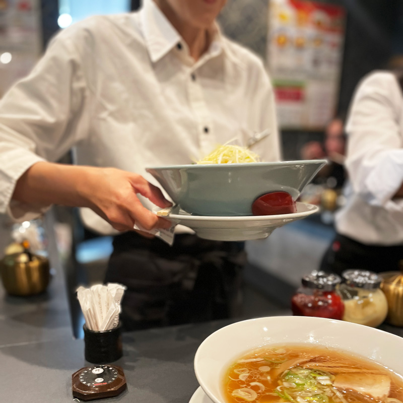 最大の特徴は、会話が弾む大きな「U字型カウンター」です。ご友人や同僚と顔を合わせながら、ゆったりと至福の一杯をお楽しみいただけます。しかもどの席に座っても、全てのメニューのオーダーを可能にしました。自慢は、肉料理の系列店を持つからこそ実現した「肉のプロが趣向を凝らしたこだわりチャーシュー」です。